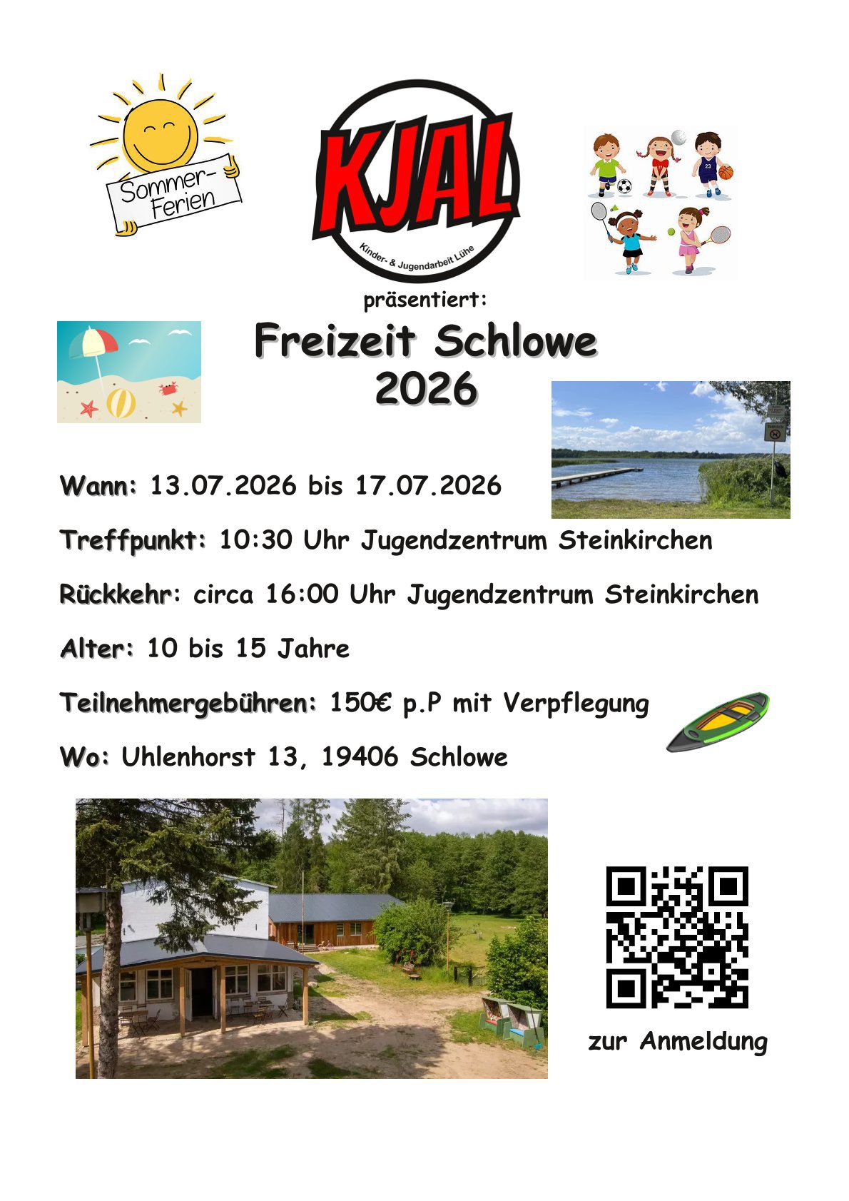 Die Jugendpflege Lühe möchte auch dieses Jahr wieder mit euch gemeinsam eine Freizeit im Sommer 2026 veranstalten. Es geht diesmal nach Schlowe in die Nähe von Schwerin, wo wir in Bungalows in unmittelbarer Nähe zu einem See hausen. Weitere Informationen und ein Elternsprechtag erfolgen im Vorfeld. Bei Fragen gerne melden.