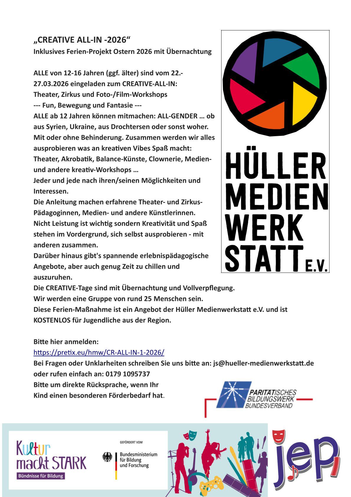 ALLE von 12-16 Jahren (ggf. älter) sind vom 22.- 27.03.2026 eingeladen zum CREATIVE-ALL-IN: Theater, Zirkus und Foto-/Film-Workshops --- Fun, Bewegung und Fantasie --- ALLE ab 12 Jahren können mitmachen: ALL-GENDER … ob aus Syrien, Ukraine, aus Drochtersen oder sonst woher. Mit oder ohne Behinderung. Zusammen werden wir alles ausprobieren was an kreativen Vibes Spaß macht: Theater, Akrobatik, Balance-Künste, Clownerie, Medien und andere kreativ-Workshops … Jeder und jede nach ihren/seinen Möglichkeiten undInteressen.