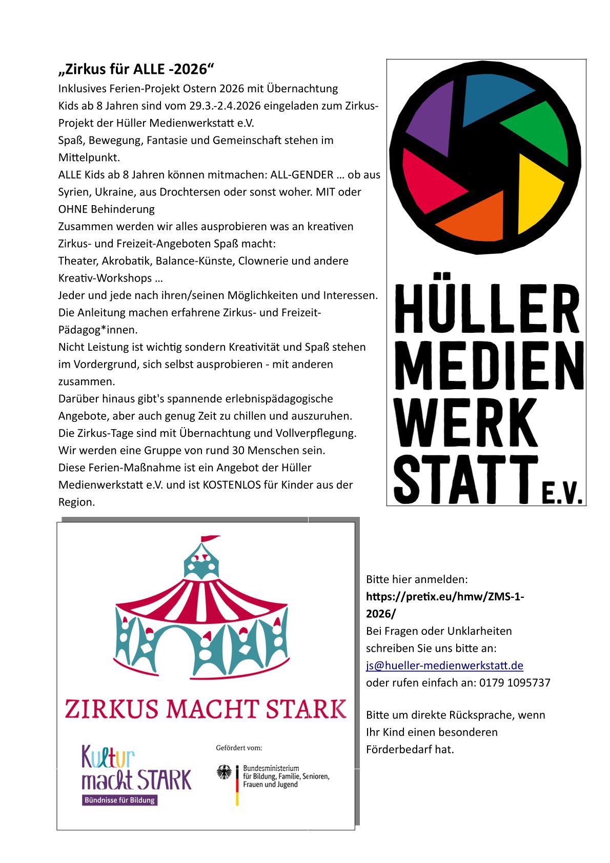 Kids ab 8 Jahren sind vom 29.3.-2.4.2026 eingeladen zum Zirkus- Projekt der Hüller Medienwerkstatt e.V. Spaß, Bewegung, Fantasie und Gemeinschaft stehen im Mittelpunkt. ALLE Kids ab 8 Jahren können mitmachen: ALL-GENDER … ob aus Syrien, Ukraine, aus Drochtersen oder sonst woher. MIT oder OHNE Behinderung. Zusammen werden wir alles ausprobieren was an kreativen Zirkus- und Freizeit-Angeboten Spaß macht: Theater, Akrobatik, Balance-Künste, Clownerie und andere Kreativ-Workshops … Jeder und jede nach ihren/seinen Möglichkeiten und Interessen.
